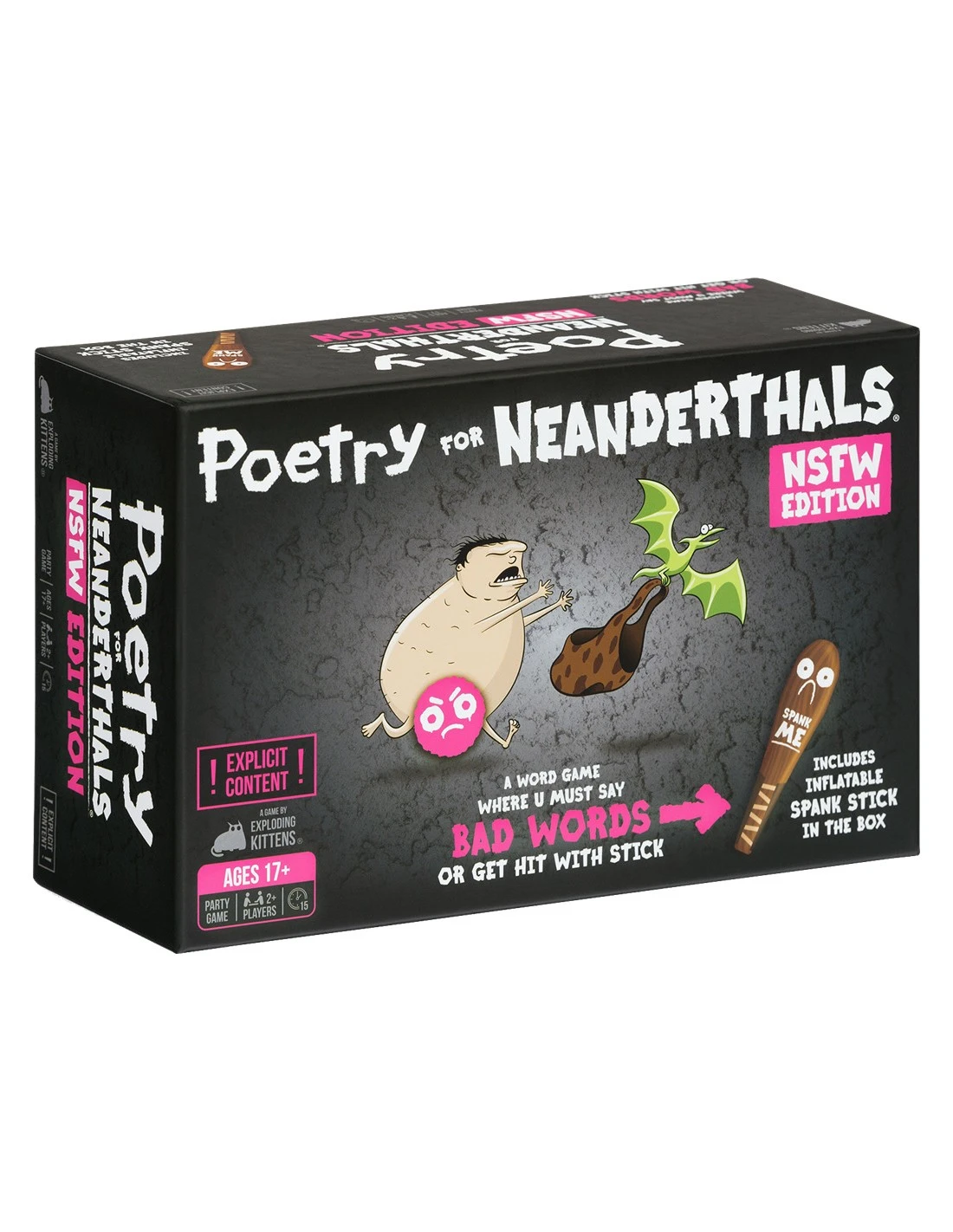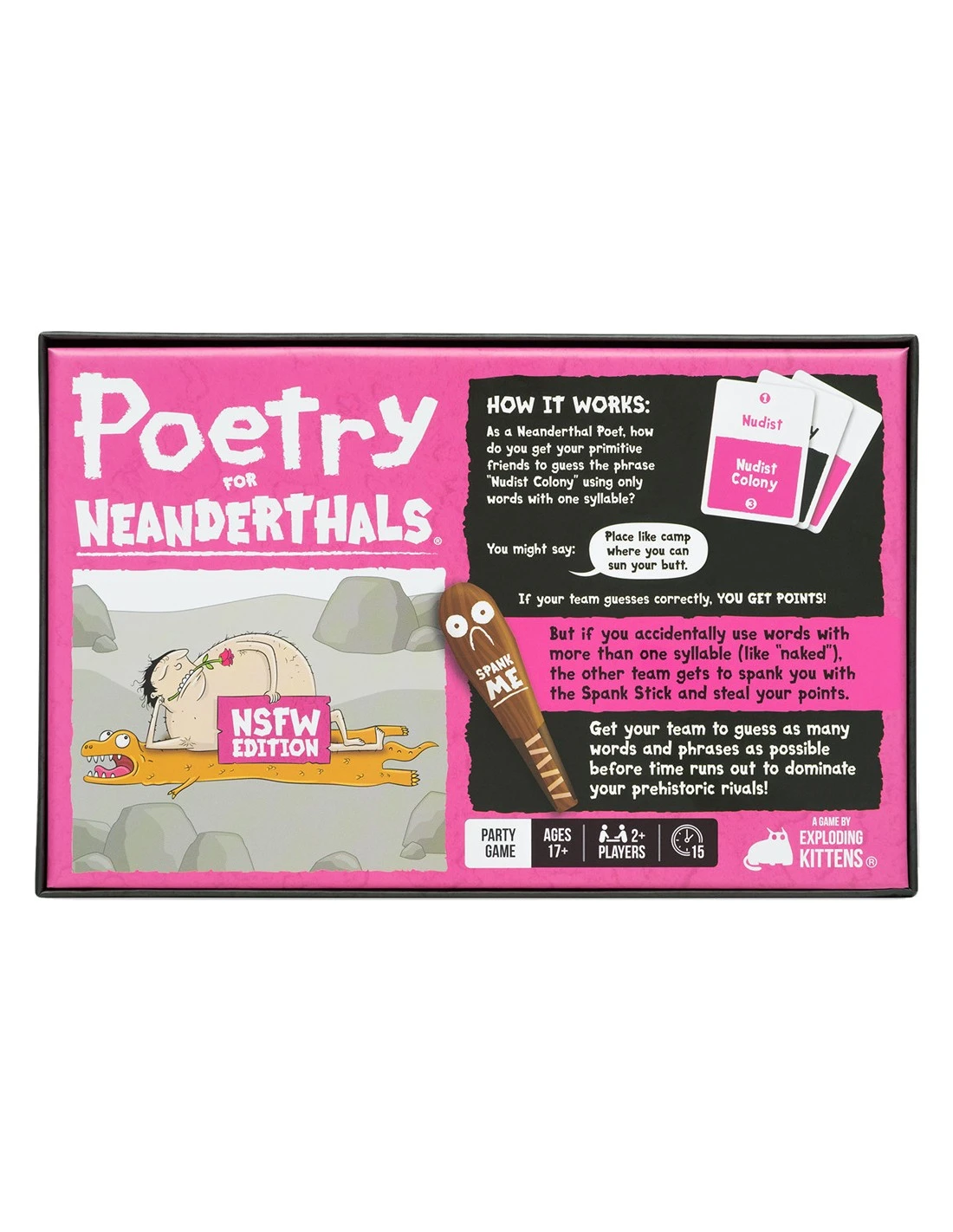 Poetry for Neanderthals: NSFW Edition is an adult party game similar to Taboo in which players earn points by getting their teammates to guess words and phrases. The catch is that they are allowed to use only single-syllable words. Enjoy getting grandma to guess phrases like “nudist beach”, “mile high club”, or “banana hammock”, but be careful. If you use any words with more than one syllable, the other team gets to spank you with the two-foot inflatable Spank Stick.