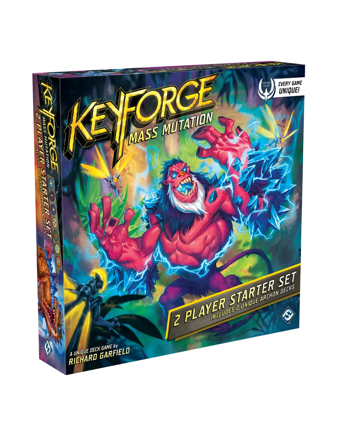 Each Mass Mutation Two-Player Starter Set contains two ready-to-play 36-card decks, bringing together three of the diverse Houses of the Crucible—each featuring their own mix of cards and unique from every other Archon Deck in existence. You’ll also find all of the tokens that you need for two players to start playing KeyForge!