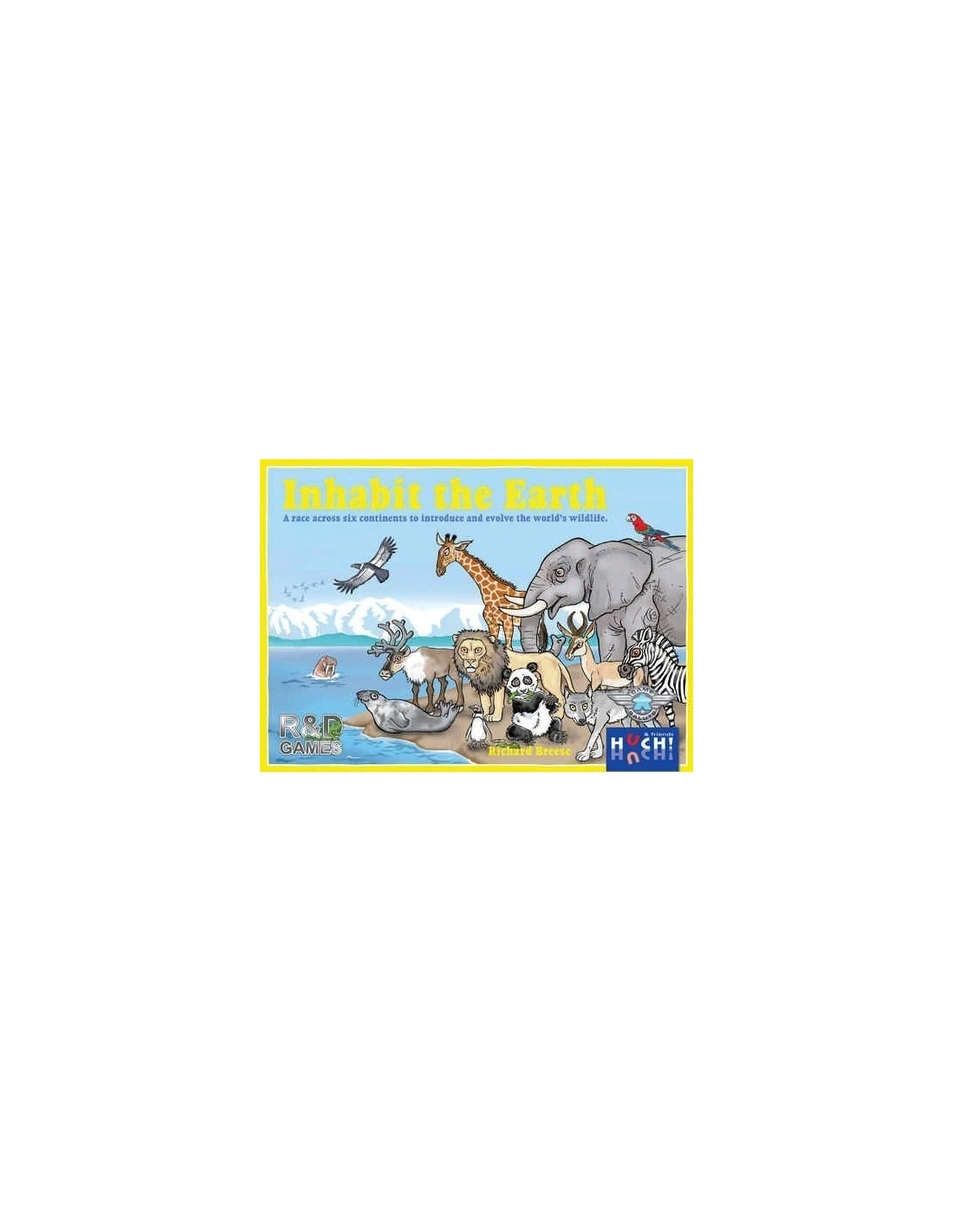 Inhabit the Earth is a race game played on six continent boards. Players create their own menagerie of up to six creatures, each of which is represented by up to six cards, by using cards to introduce, multiply, evolve, and adapt their creatures. Each of the 162 unique cards identifies a creature’s class, a continent and terrain that the creature inhabits, and a special or scoring ability.