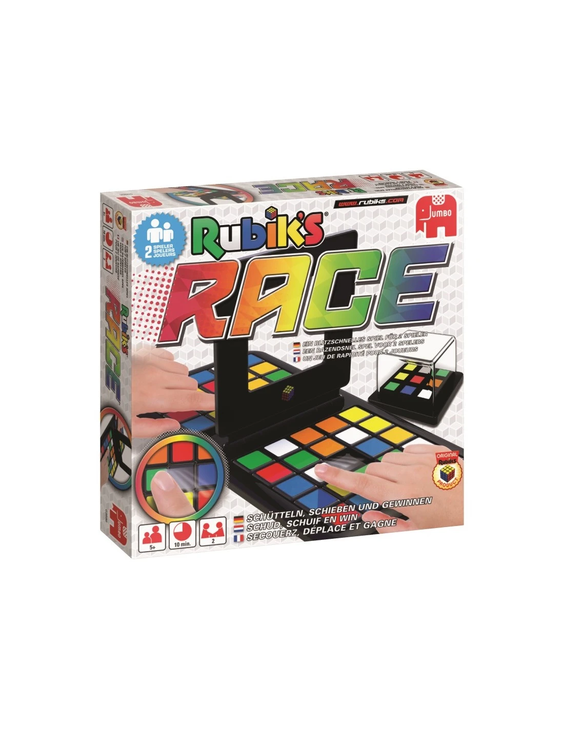 In this game players race to complete a puzzle. Each player has a 5×5 slide puzzle with one tile missing. At the beginning of each round, the “Scrambler”, a device that looks like a 3×3 Boggle grid with the cover on — but using colored cubes instead of letters — is shaken. Players then try to make the 3×3 center of their puzzle match the Scrambler.