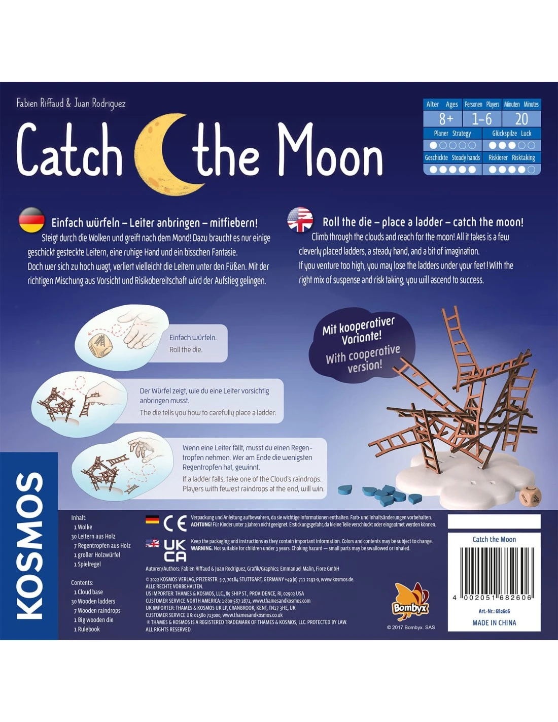 Climb through the clouds and reach for the moon! All it takes is a few cleverly placed ladders, a steady hand, and a bit of imagination. Reach for the moon, but don’t stretch yourself too thin, or you may lose the ladders under your feet. With the right mix of suspense and risk-taking, you will ascend to success. In this dexterity/stacking game with a whimsical theme and beautiful design, players take turns rolling a die to determine how they must place their wooden ladder (it must touch one other ladder, two other ladders, or be the highest point. Ladders will shift as more pieces are added, adding an element of suspense and unpredictability. Raindrops are given to players whose ladders cause the structure to collapse; the winner is the player with the least amount of raindrops at the end of the game!