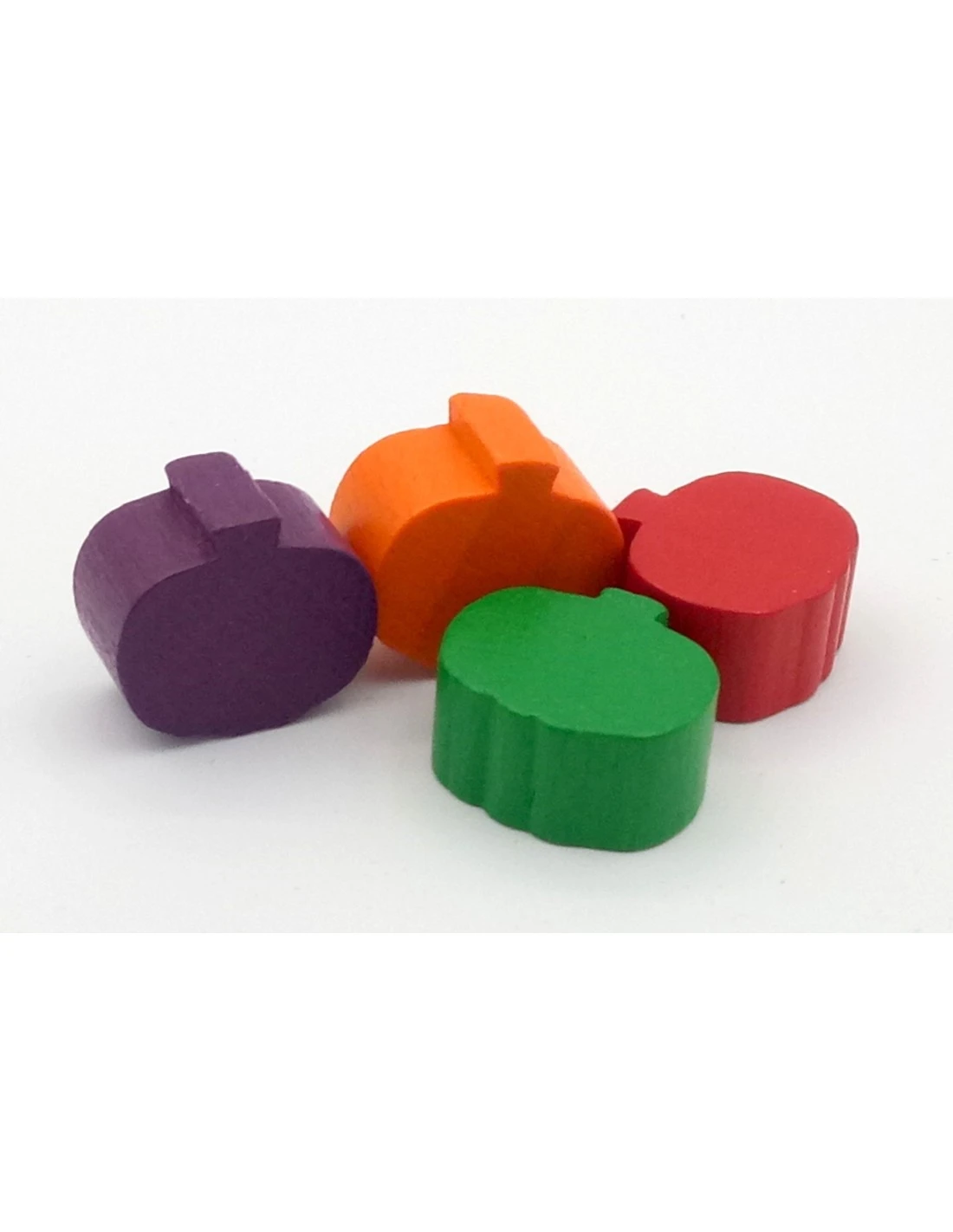 Houten spelfiguur in de vorm van een pompoen. De afmetingen zijn 1,5 cm breed x 1,5 cm hoog x 1 cm dik.
