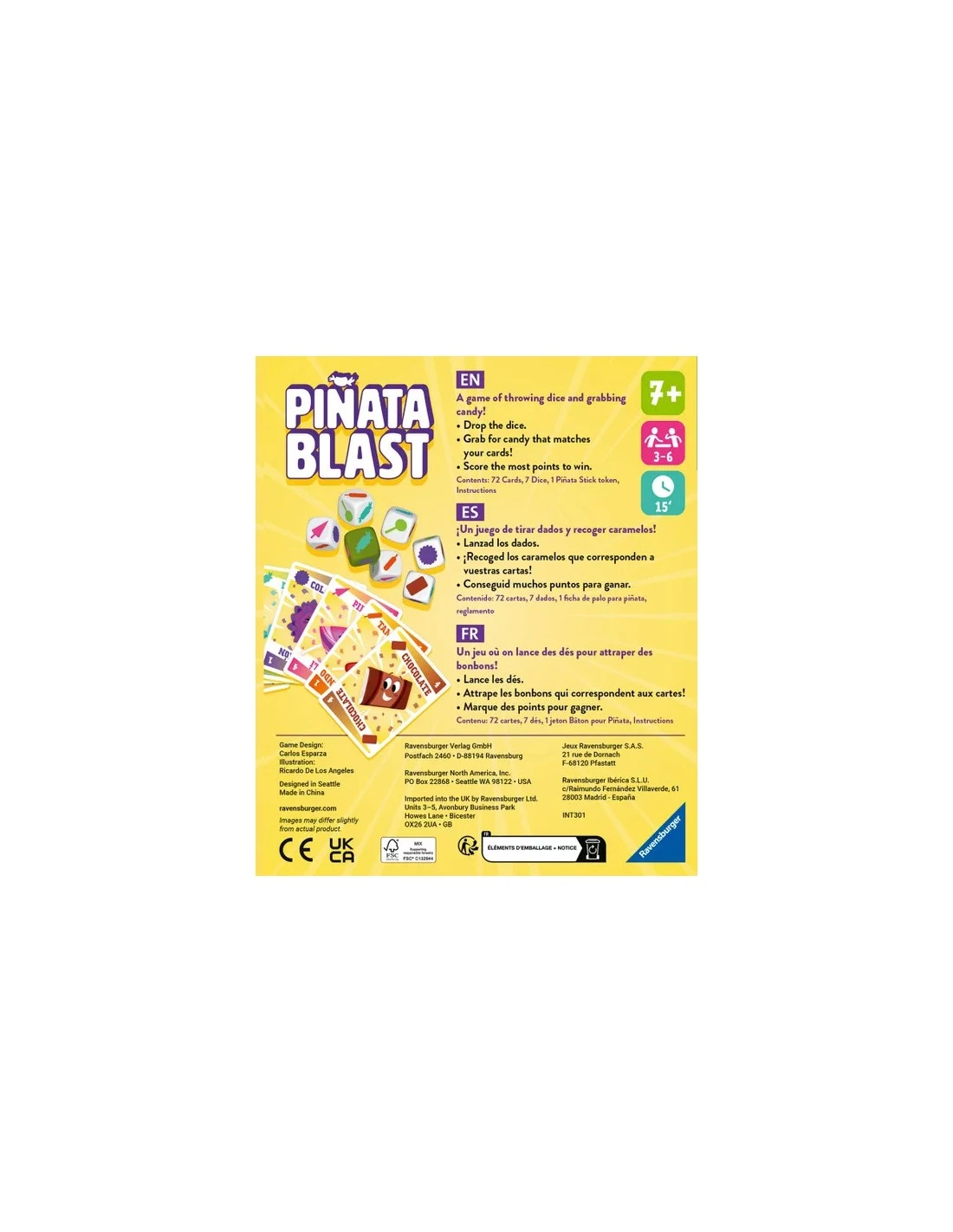 Each round in Piñata Blast, someone drops the dice, then everyone tries to snag the dice that match their cards first, while not grabbing the rotten candy. Earn the most points to win!