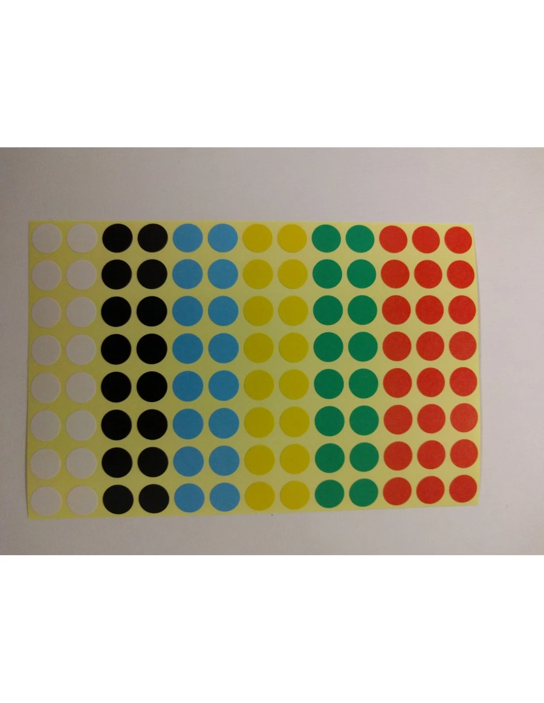 Stickervel stippen 8mm, model 3. Elk vel bevat 104 stippen (16x wit, zwart, blauw, geel, groen en 24x rood)