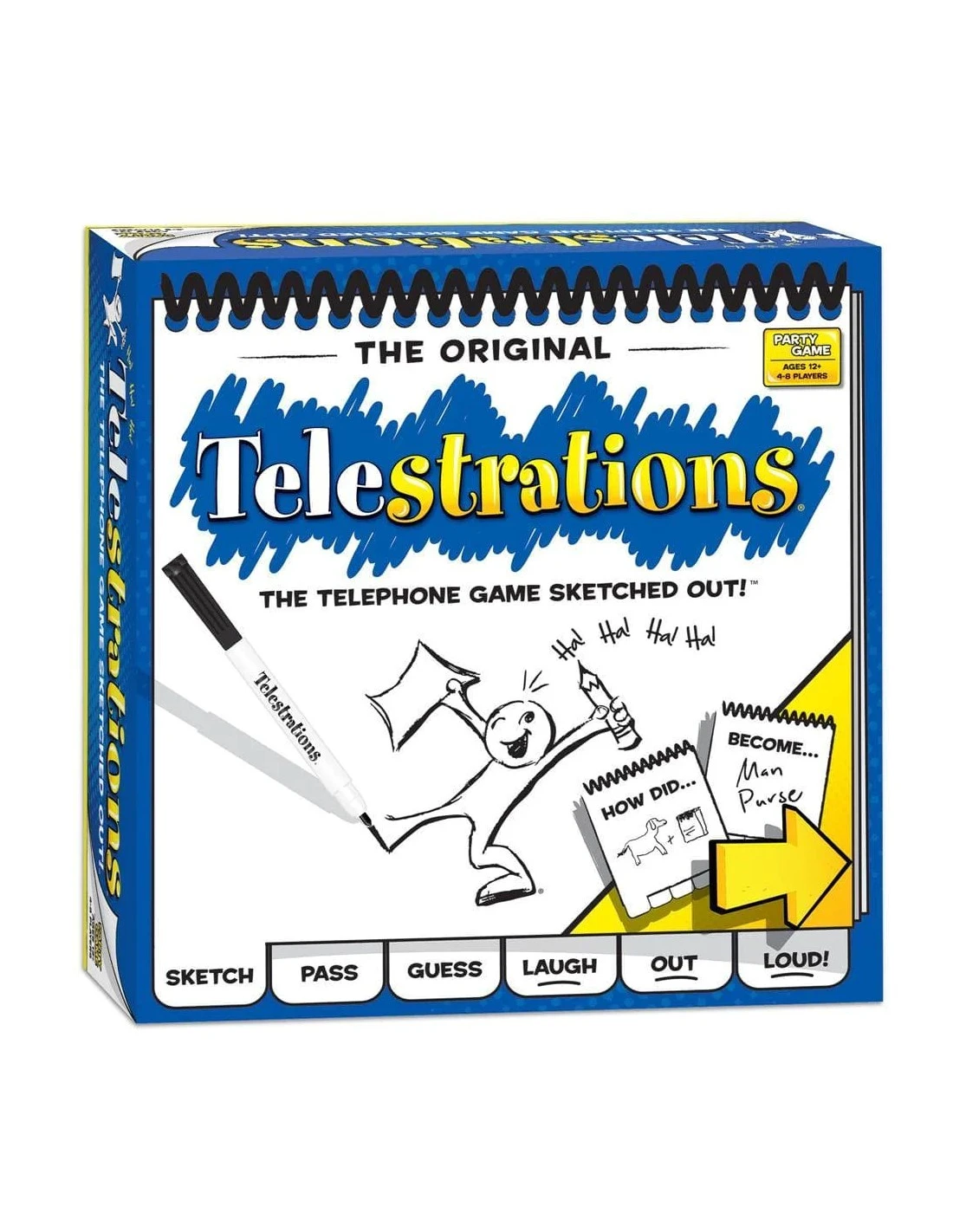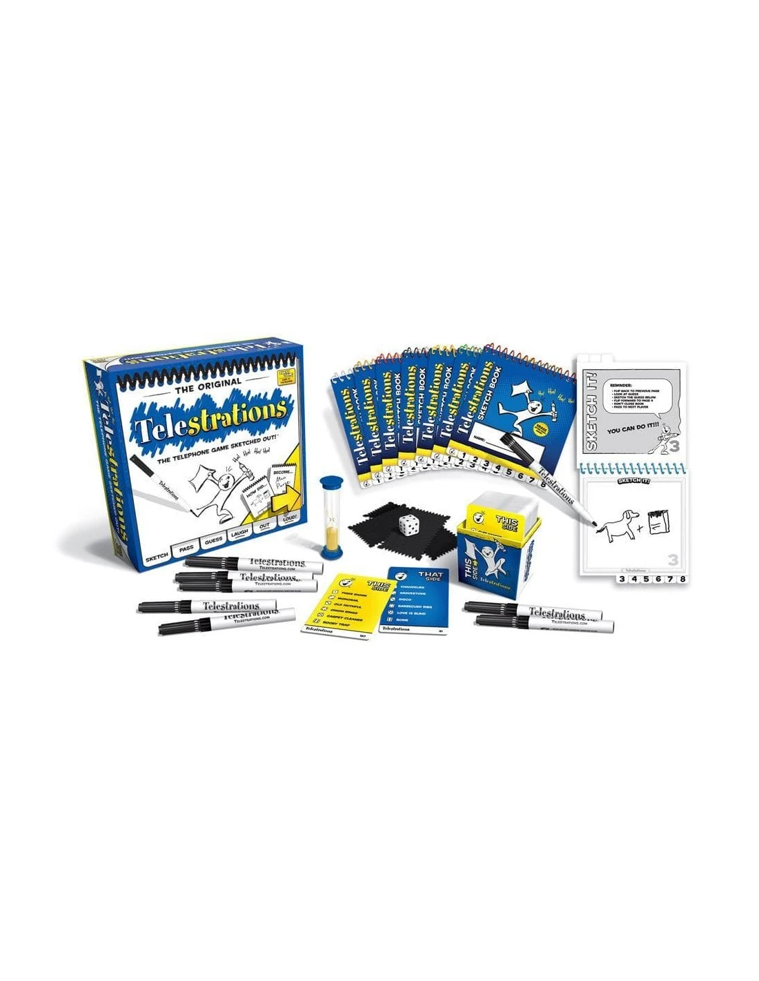 “Telestrations contains eight erasable sketchbooks and markers, a die, a 90 second sand-timer and 2,400 words to choose from.”